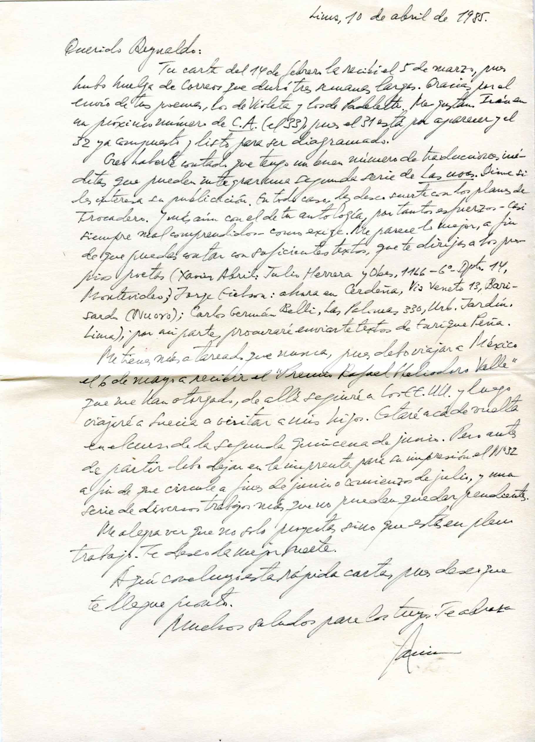 Tu carta del 14 de febrero la recibí el 5 de marzo, pues hubo huelga de correos que duró tres semanas largas. Gracias por el envío de tus poemas, los de Violeta y Hugo Padeletti. Me gustan. Irán en un próximo número de C.A. (el 33), pues el 31 está por aparecer y el 32 ya compuesto y listo para ser diagramado.